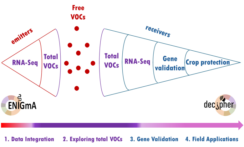 Leverage insights from the ENIGmA and DECIPher to develop and validate VOC-based solutions in receiver plants, for sustainable crop management under field conditions. This includes testing the use of VOCs as natural elicitors of plant defenses, evaluating their potential in intercropping systems to promote tolerances to stresses, and exploring GbVOCs -based formulations for controlled VOC release.
